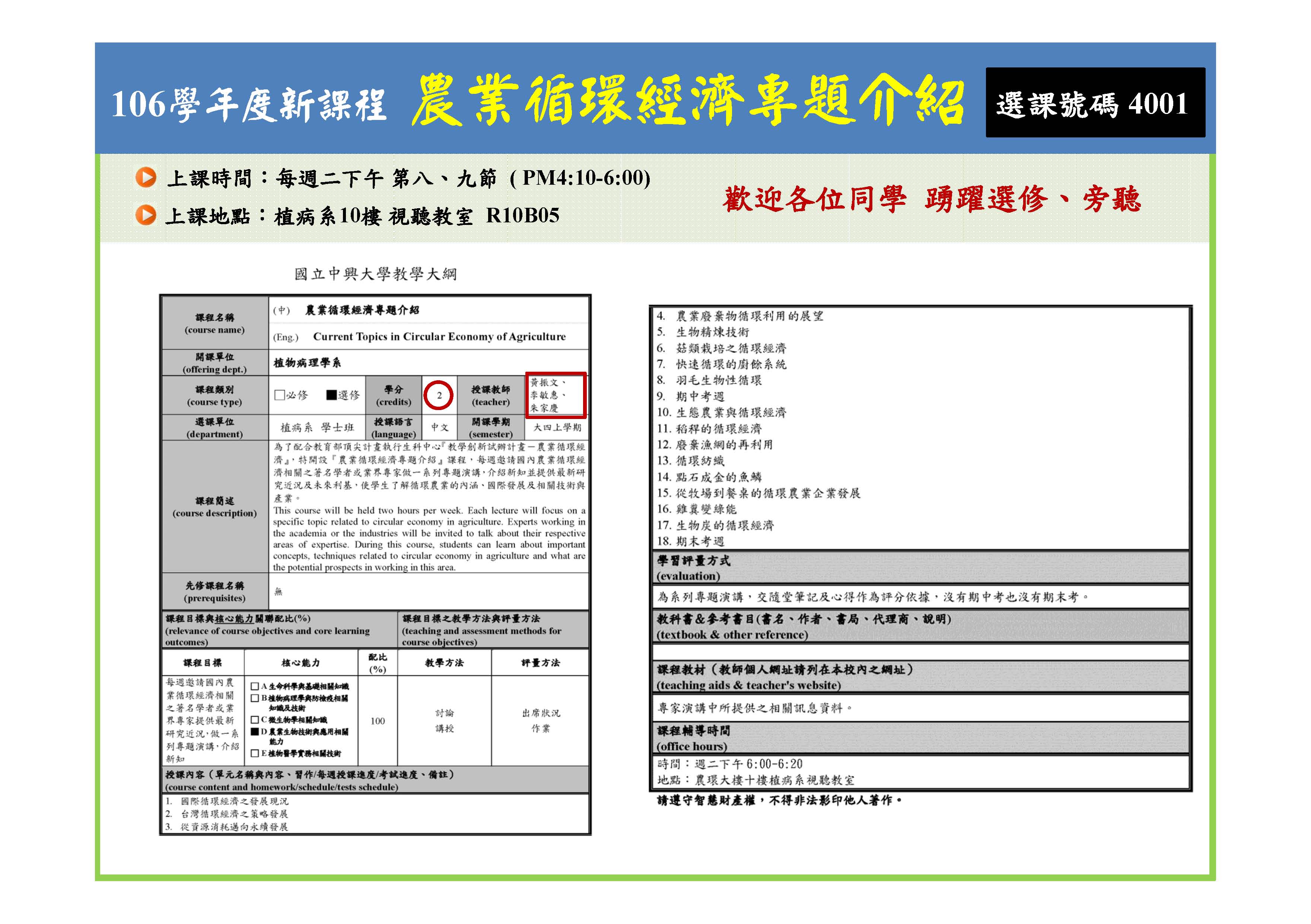 因此自106學年度起新增開設跨領域、跨院系之整合型農業循環經濟課程兩門-